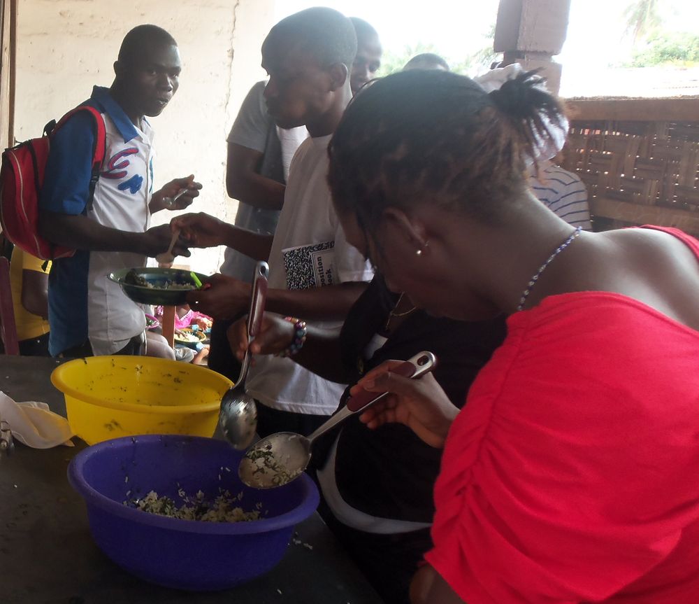 9 staff members helping themselves with some of the potato greens and rice