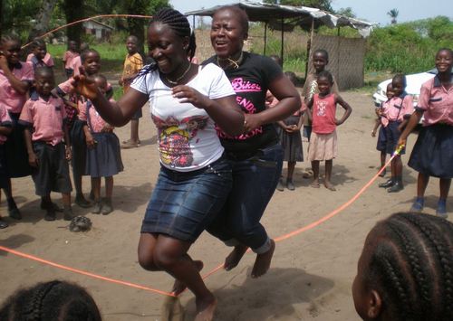 Two teachers challenging each other in rope jumping