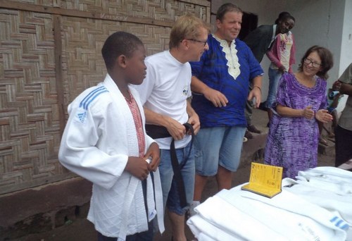Student in his judo clothes donated by P-O, as Lena cheers
