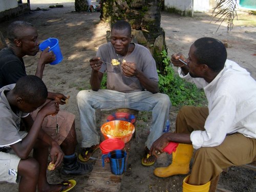 The Principal (with boots) eating with the workers during the zincking of the project